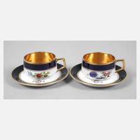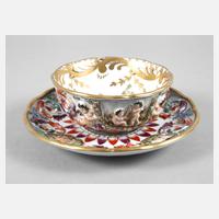um 1820, Pinselmarke W, Tasse auf kurzem Stand mit Ohrenhenkel, bunt mit Blumen bemalt, Schriftzug M. Ott vor Münzenburg, Goldrand, innen Reliefdekor ”gebrochener Stab” sowie eine Blüte, orig. Untertasse mit korrespondierendem Dekor, diese mit leichten Kratzspuren, sonst alles gut erhalten, H zusammen 6 cm.