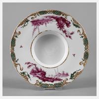 Pinselmarke um 1765–1774, tief gemuldete Untertasse für eine sogenannte Zittertasse, flache Fahne mit feiner Lupenmalerei in Mangan, Landschaftsdekor mit Felsen, Booten und Häusern, am Rand umlaufende Bordüre mit Schuppenmuster in Grün und Schwarz, goldene Spitzenkante, am Stand minimale Fehlstelle, sonst altersgemäß guter Zustand, D 13,5 cm, D innen oben 6 cm.