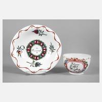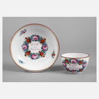 1810–30, bauchige Tasse auf kurzem Stand mit Ohrenhenkel, bunt mit Blüten bemalt, schauseitig eine Kartusche mit Besitzername Johann Gottlob Weiszpflug, goldene Festons, Untertasse etwas mit leichter Farbvarianz bemalt aus hellerem Porzellan (später ergänzt?) mit Aufschrift ”Der Freundschaft”, Untertasse mit kleinem Chip am Rand, H zusammen ca. 6 cm.