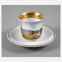 um 1880, blaue Adlermarke mit Buchstaben DPM, glockenförmige Tasse, kurzer Stand, abgekanteter Ohrenhenkel, schauseitig eine fein gemalte Fabrikansicht mit Personenstaffage, partielle Vergoldung, passende Untertasse, Vergoldung etwas berieben, sonst unbeschädigt, H 10,5 cm.