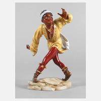 Modell von Richard Förster nach einem Original von geschnitzten Figuren von Erasmus Grasser (1450–1518), ausgestellt im Münchner Stadtmuseum, Ausführung um 1935, Prägemarke Allach, maurischer Springtänzer in buntem Gewand und Vergoldung, auf einem Felsen stehend in Tanzpose, perfekte Erhaltung, H 22 cm.