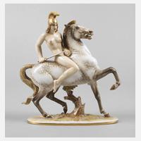 wohl Allach, um 1930, Entwurf Prof. Theodor Kärner, signiert, polychrom bemalt und vergoldet, am Schwert kaum sichtbar restauriert, H 18 cm.