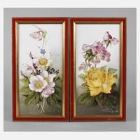 um 1980, Porzellan signiert Siegfried Königer, Porzellanmalerei Dachau, handgemalt, zwei hochrechteckige Wandbilder mit gemalten Blütenbuketts, der Holzrahmen vergoldet und mit rotem Samt beklebt, Wandaufhängungen, 18,5 x 34 cm.