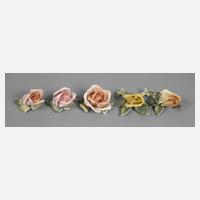 1930er Jahre, Porzellan, grüne Stempelmarken, verschiedenfarbig bemalte Rosenblüten als Tischdekoration, gute Erhaltung, L max. 10 cm.