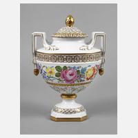 neuzeitlich, ungemarkt, dreiteilig, bestehend aus Sockel, Amphore und Deckel, feine polychrome Handmalerei und reiche Vergoldung, gute Erhaltung, H 46 cm.