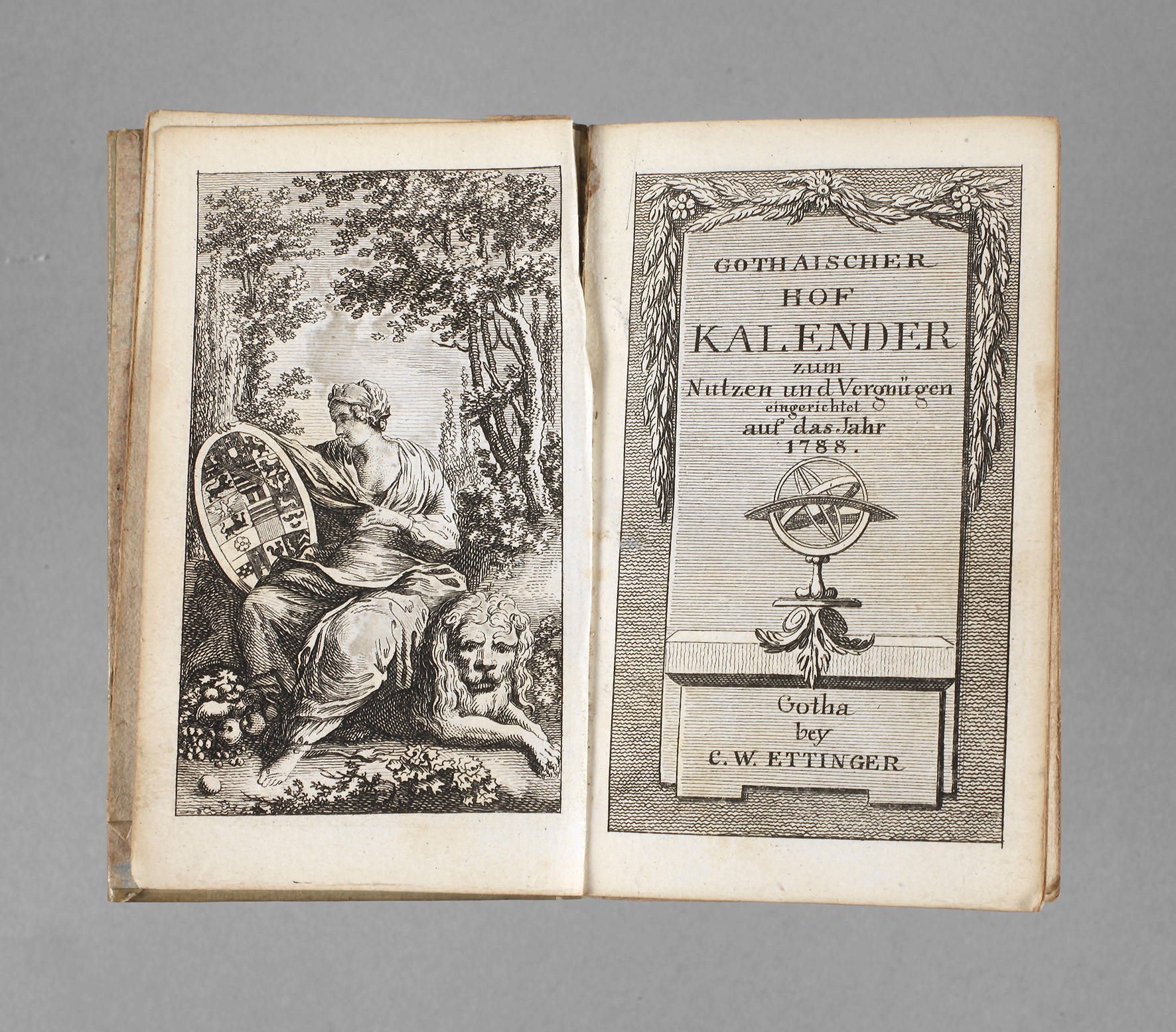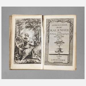 zum Nutzen und Vergnügung eingerichtet auf das Jahr 1788, bey C. W. Ettinger, Gotha 1788, Format 12°, 26 Blätter, 98 S., 5 Blätter, 120 S. und 12 Blätter, mit gestochenem Frontispiz, Schmucktitel, vier Modetafeln (Ender fc.) und zwölf Monatstafeln in Kupfer sowie gefaltete Geschlechtstafel des sächs. Hauses, Goldschnitt, in Pappeinband der Zeit, Exemplar mit Alters- und Gebrauchsspuren, fünf Textblätter mit Eckabriss, Bindung gelockert und Einbandrücken lädiert.