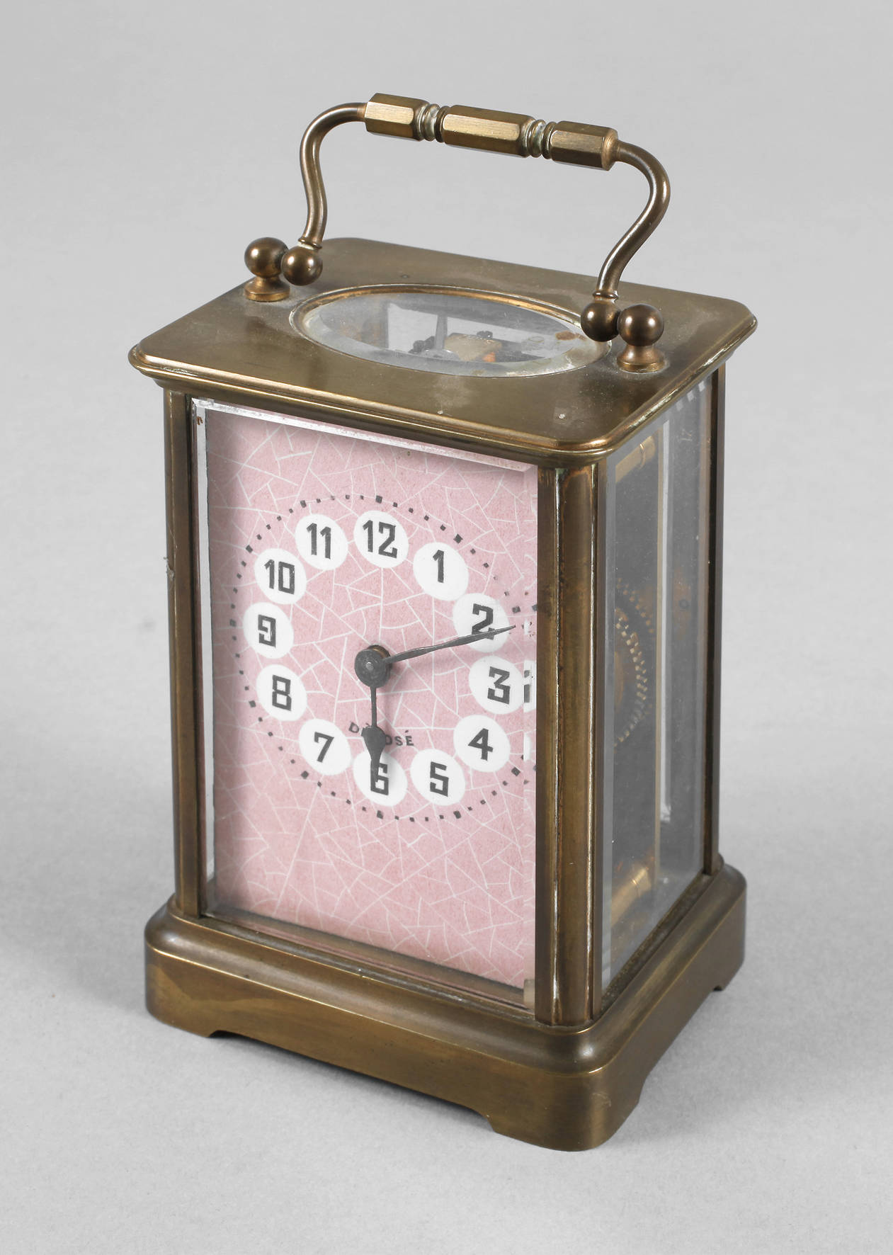 Frankreich, um 1900, auf roséfarben emailliertem Ziffernblatt, bezeichnet Deposé, allseitig verglastes Messinggehäuse, Facettschliff, Werk mit sichtbarem Echappement, funktionstüchtig, mit Schlüssel, der kleine Zeiger locker, H 15 cm.