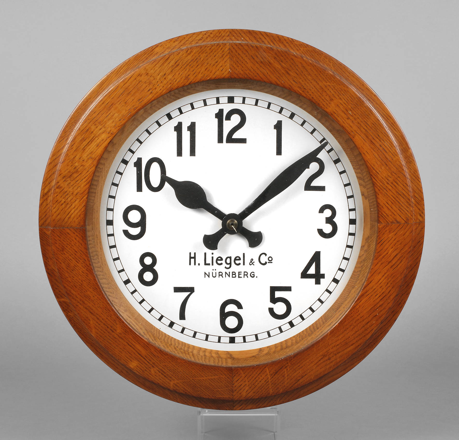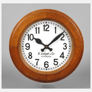 gemarkt H. Liegel & Co. Nürnberg, um 1930, Rundrahmen aus Eichenholz, versilbertes Metallziffernblatt, Quarzwerk ergänzt, D 45 cm.