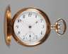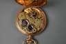 um 1912, glattes Zweideckel-Goldgehäuse gestempelt 585 und Marke Bundh, körnig vergoldetes Ankerwerk, makelloses Emailziffernblatt mit vertiefer Mitte und kleiner Sekunde, Goldzeiger, funktionstüchtig, eine winzige Delle sonst guter Zustand, im orig. Etui der Firma Stöckel Plauen, D 50 mm, G ca. 80 g.