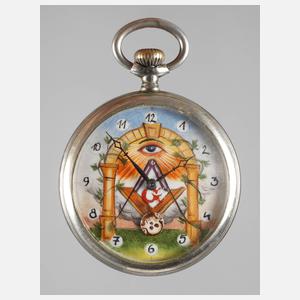 gemarkt Zyma, Schweiz, 1920er Jahre, flaches glattes Nickelgehäuse, Ankerwerk, außergewöhnlich gestaltetes Emailziffernblatt, Darstellung eines Torbogens mit dem allsehenden Auge, darunter Winkel und Zirkel sowie Buchstabe ”G”, kleine Sekunde in Form eines sich drehenden Totenkopfs, funktionstüchtig, D 50 mm.