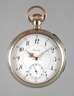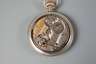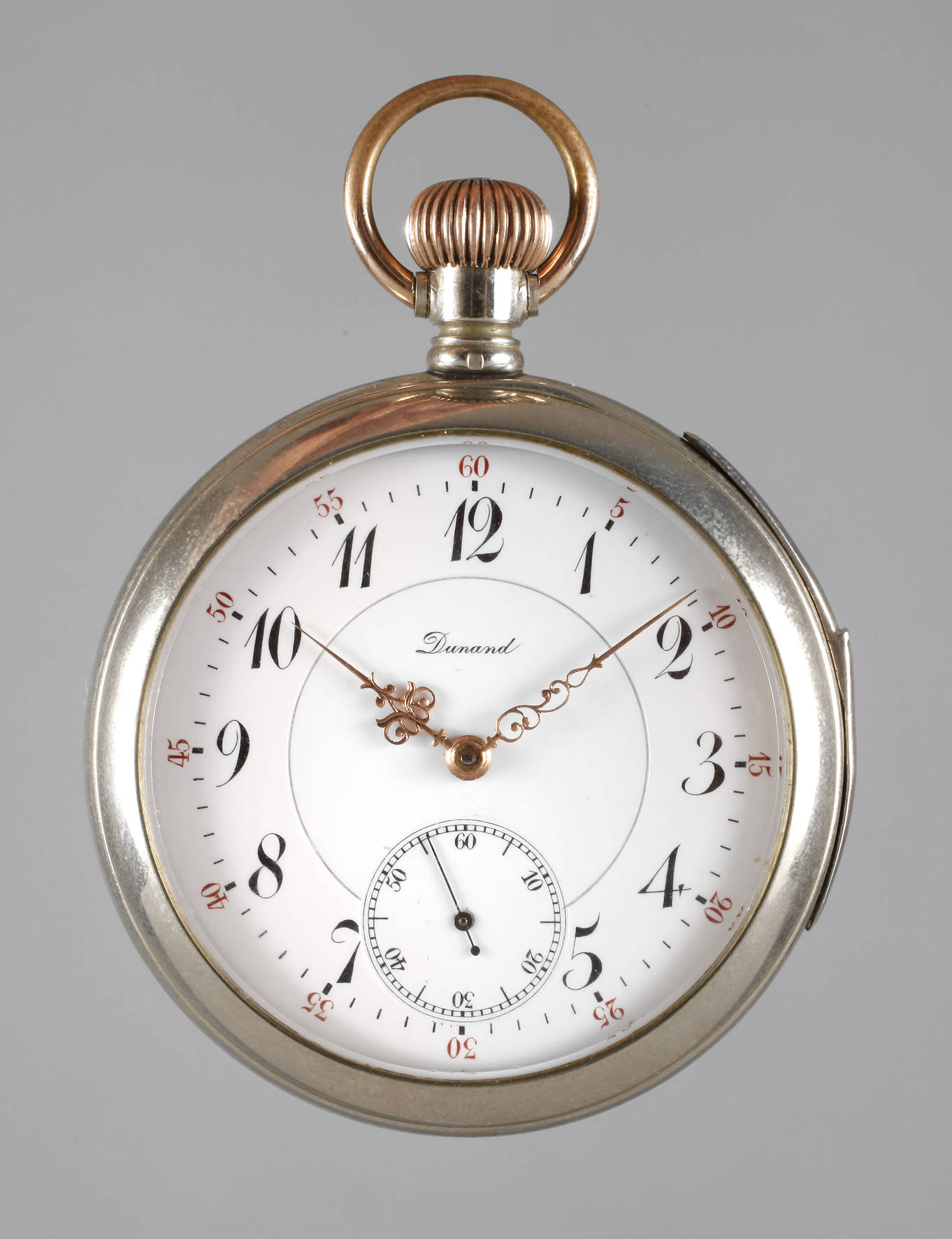 auf Ziffernblatt und Werk gemarkt Dunand, Schweiz, Ende 19. Jahrhundert, vernickeltes Gehäuse, Ankerwerk mit Viertelstundenschlag auf zwei Tonfedern, auszulösen über seitlichen Schieber, makelloses Emailziffernblatt mit vertiefter Mitte und kleiner Sekunde, Goldzeiger, funktionstüchtig, Vergoldung des Bügels abgegriffen, sonst gute Erhaltung, D 52 mm. Info: Ein vergleichbares Stück der Firma Dunand Freres/Genf in 14 K Gold aus dem Jahre 1910 im NAWCC-Museum ausgestellt.