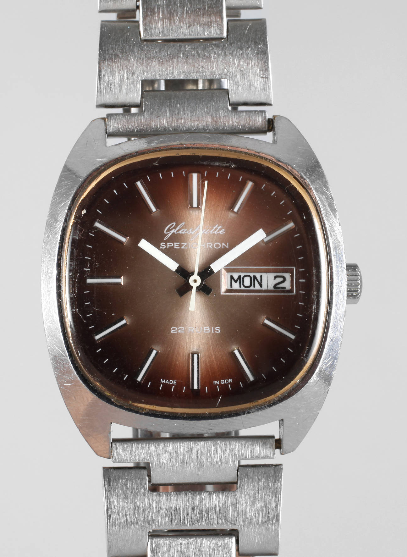 Modell Spezichrom, 1970er Jahre, Edelstahlgehäuse, Deckel mit Widmung ”Ehrengeschenk des Zentralkomitees der SED”, Automatikwerk mit Wochentag und Datum, Zentralsekunde, kupferfarbenes Ziffernblatt, funktionstüchtig, Zustand 2, Maße 35 x 42 mm.