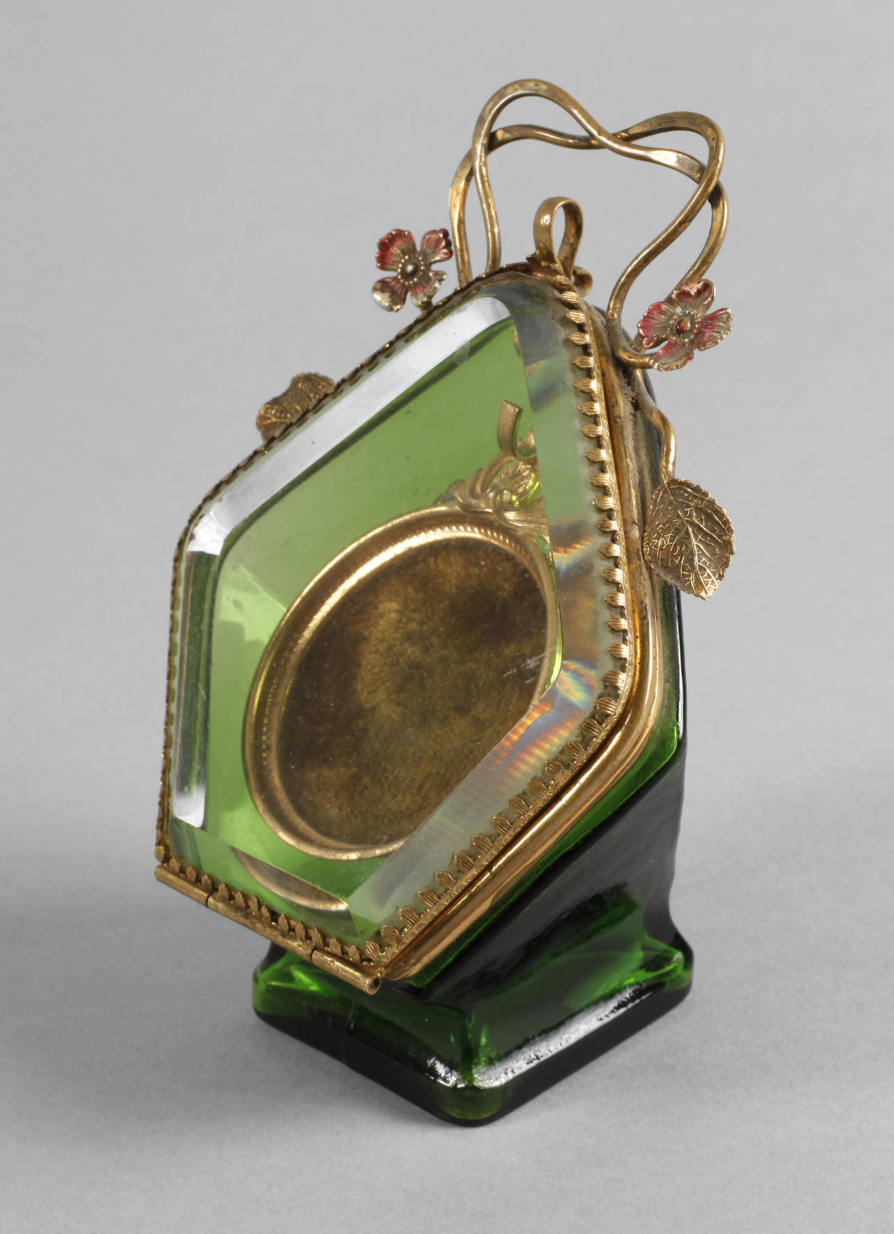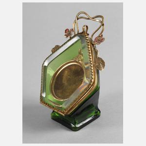 um 1900, aus grünem Glas formgeblasen, schwerer facettierter Deckel, vergoldete Messingmontierung, H 13 cm.