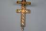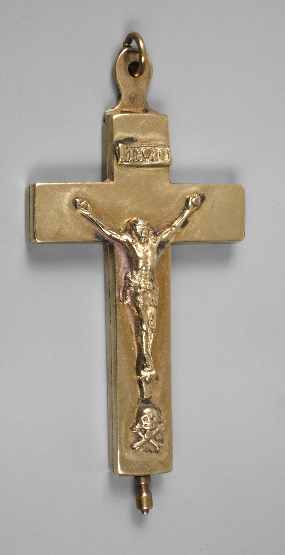19. Jh., Messing vergoldet, rückseitig reliefierte Symbolik, Würfel, Leiter usw. schauseitig plastischer applizierter Jesus am Kreuz, innen kleine Papierantiquitäten mit Heiligennamen, unten zum Schrauben, innen nicht ganz komplett, L 8,5 cm.