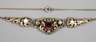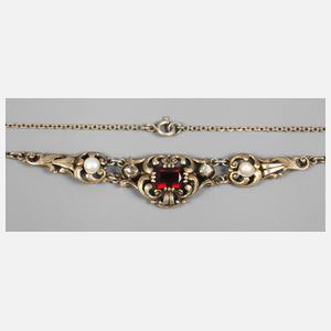um 1920, unleserlich gestempelt, vergoldet, besetzt mit einem Granat, zwei küstlichen Perlen und zwei weißen Steinen, L 38 cm, G ca. 9,4 g.