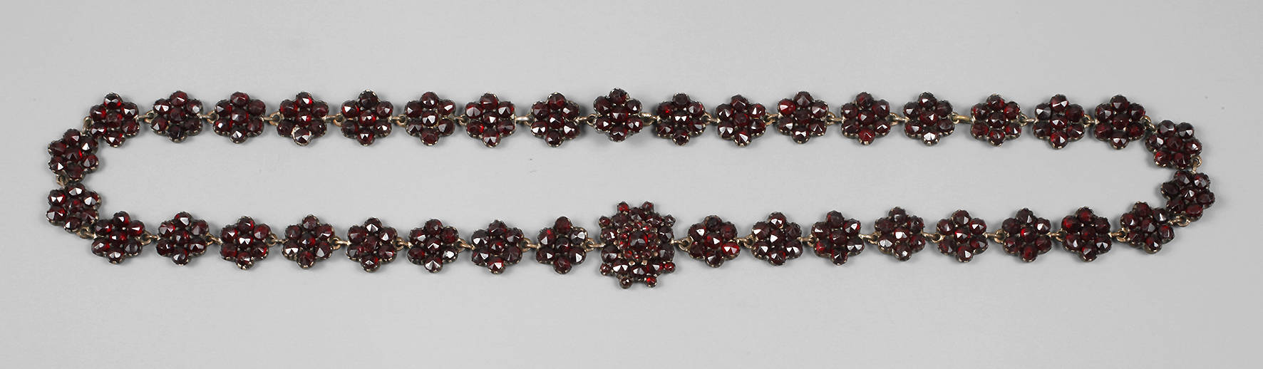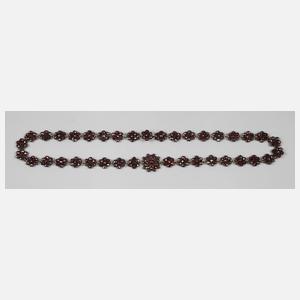 Böhmen, um 1910, Metall besetzt mit kleinen, rund facettierten Granatsteinen, als Blüten gestaltet, die mittig größte ca. 1,5 cm, L 44 cm.
