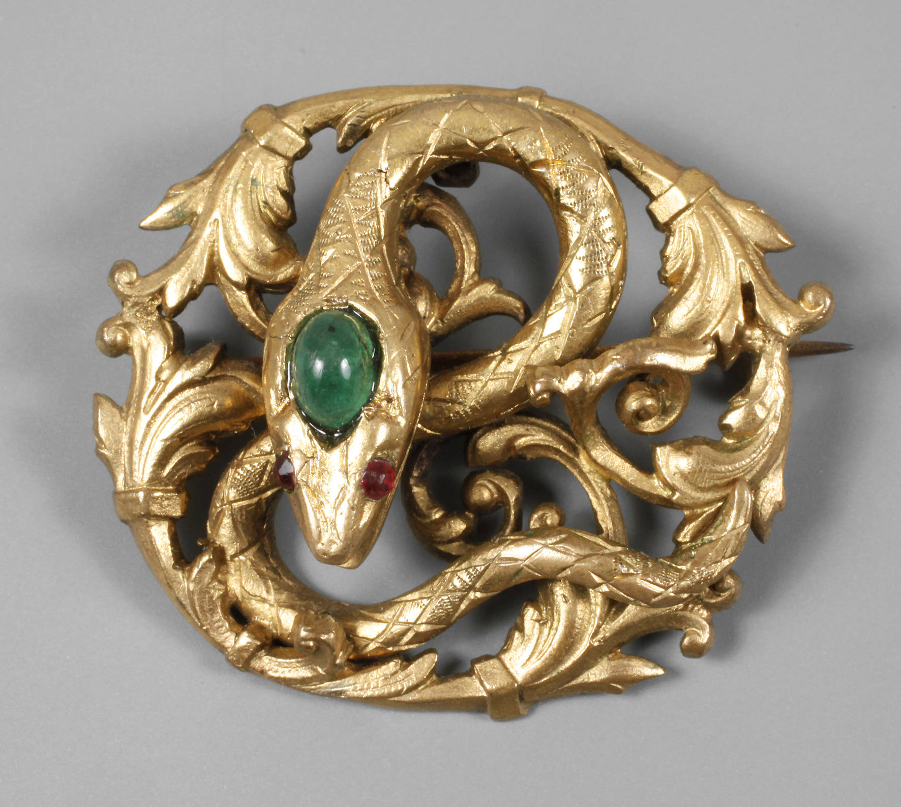 um 1880, Messing vergoldet, Schlange auf einem Bett aus Blättern liegend, besetzt mit einem Smaragd? und zwei Rubinen?, Tragespuren, D 3,5 cm.