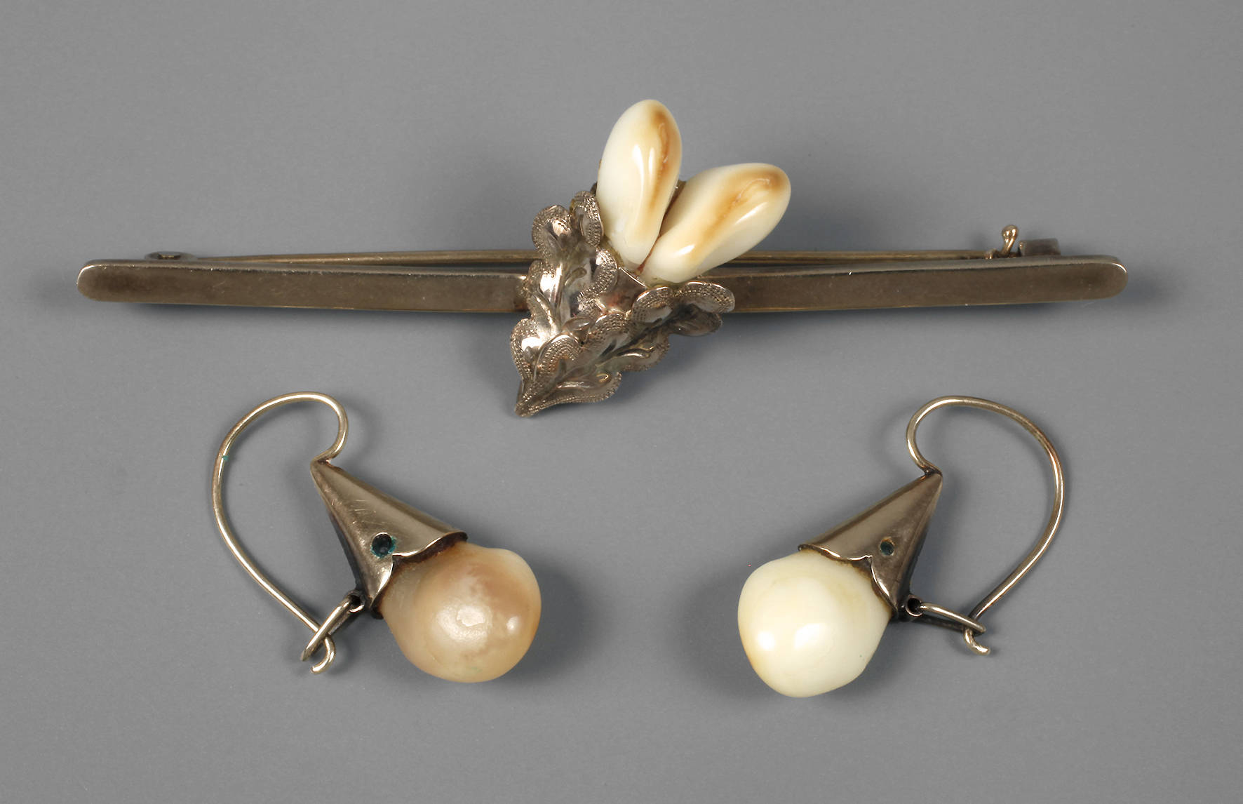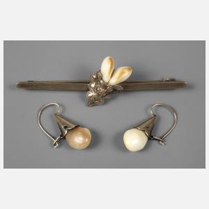Mitte 20. Jh., Rotgold, Brosche gestempelt 333, Ohrringe 14 Karat geprüft, besetzt mit Hirschgrandeln, L 2,5 und 6,5 cm, G zus. ca. 8,7 g.