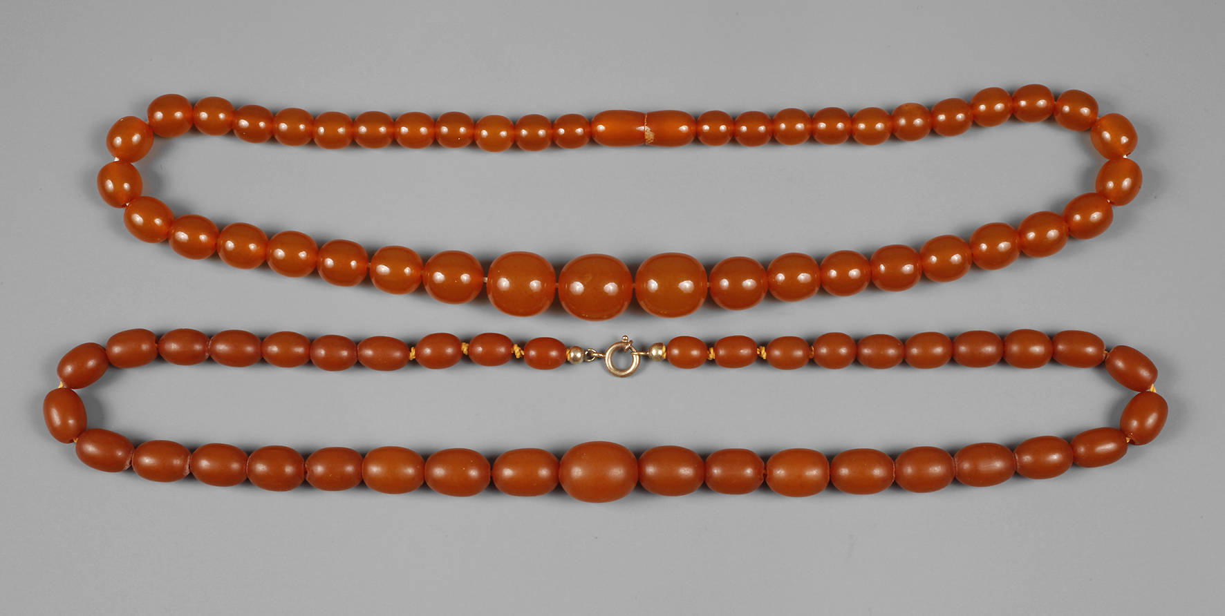 um 1930, aus olivenförmigen, matten Bernsteinen im Verlauf, die größten ca. 1,5 cm, eine mit Schraubverschluss, die andere Messing, L 40 und 44 cm.