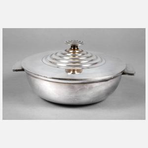 Entwurf der Serie Luc Lanel, um 1930, Prägemarke, Modellnummer 42, Metall versilbert, Deckelterrine Art déco mit geripptem Deckel und gerilltem Knauf, gute altersgemäße Erhaltung, D 24 cm.