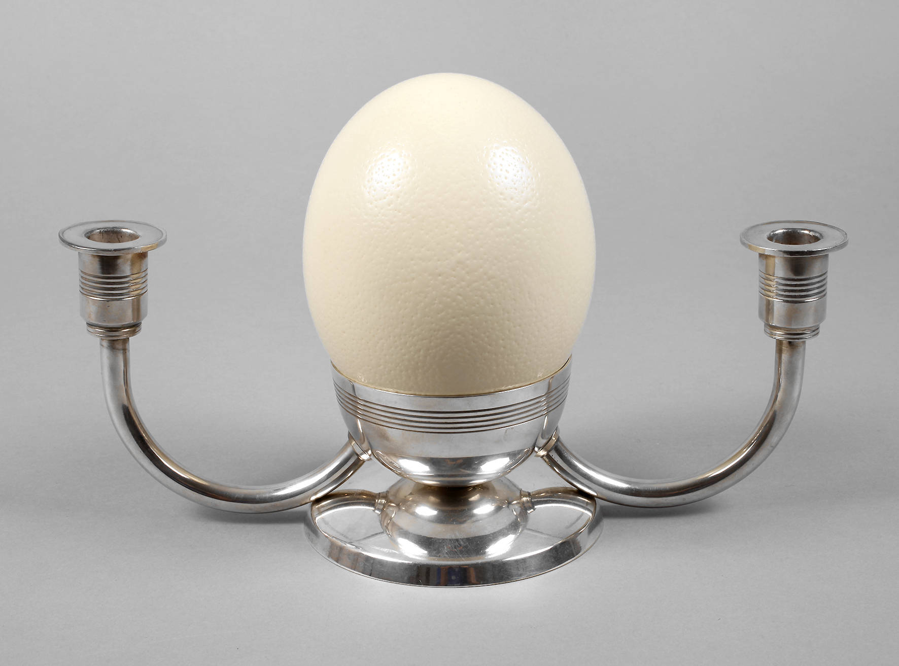 Frankreich, 1930er Jahre, gestempelt O. Gallia 0428, Metall versilbert, mittig ein abnehmbares ergänztes? Straußenei, ohne Elektrik, leichte Altersspuren, H 21 cm.