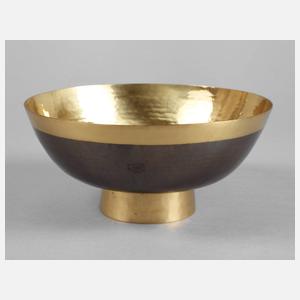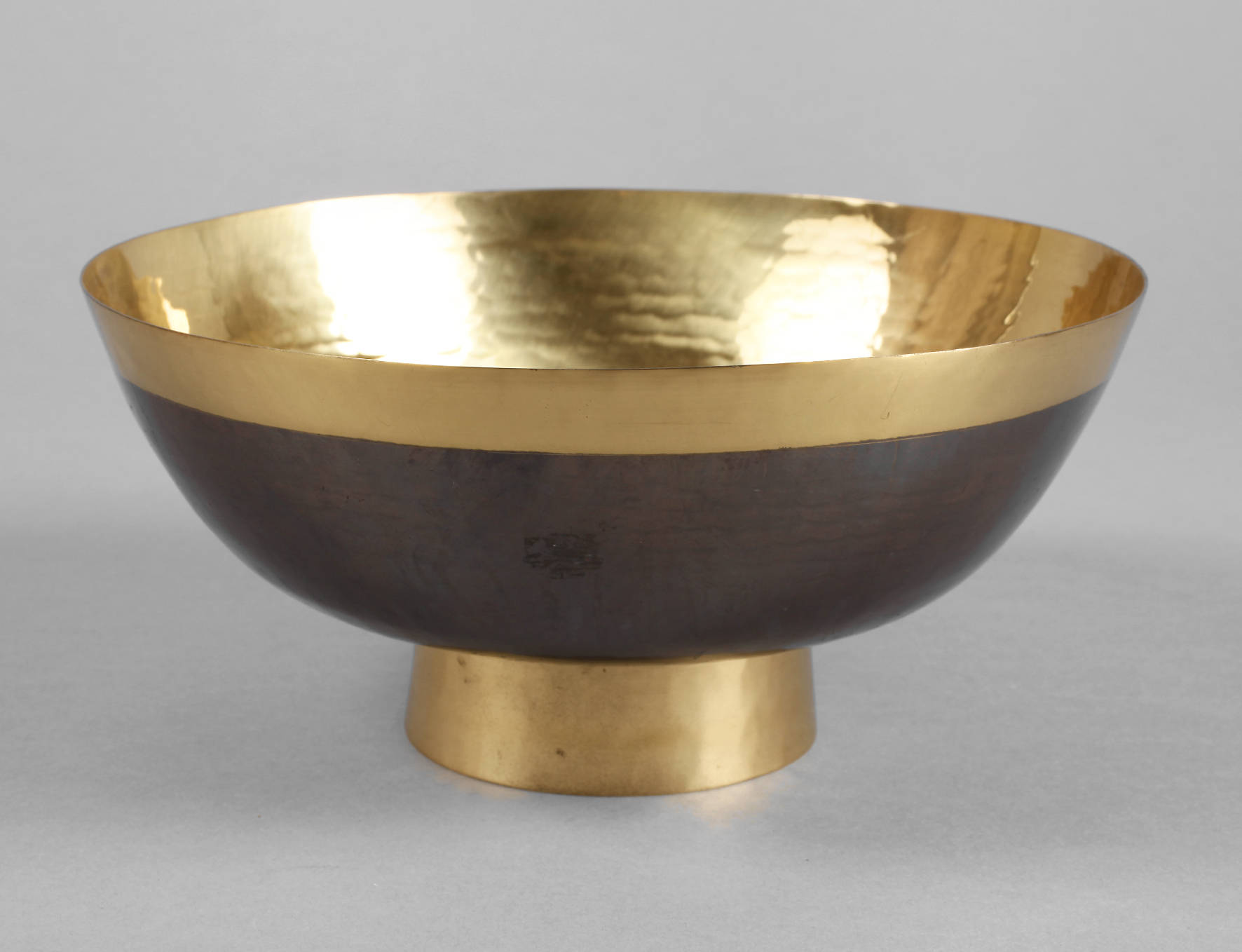 um 1935, geprägtes Künstlermonogramm HP mit Schriftzug Handarbeit, Messing geschmiedet, martelliert und braun patiniert, innen leichte Altersspuren, D 20,5 cm. Quelle: Bröhan-Museum Metallkunst der Moderne, Band VI, S. 259, Nummer 238, dort als kleine Deckeldose, H 15 cm.