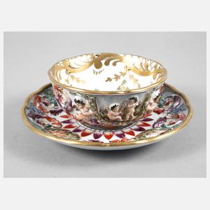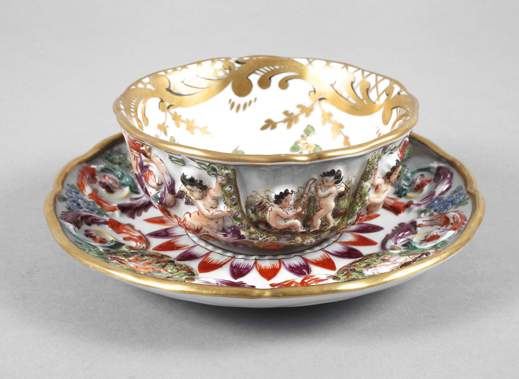 Italien, um 1900, blaue Neapelmarke, reich verziert mit bunt gemalten Reliefs, Putten, Rollwerk und Blüten, schwarz konturierte Goldbemalung, Tasse mit seitlichem Oberflächenchip, D 17,5 cm.