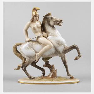 wohl Allach, um 1930, Entwurf Prof. Theodor Kärner, signiert, polychrom bemalt und vergoldet, am Schwert kaum sichtbar restauriert, H 18 cm.