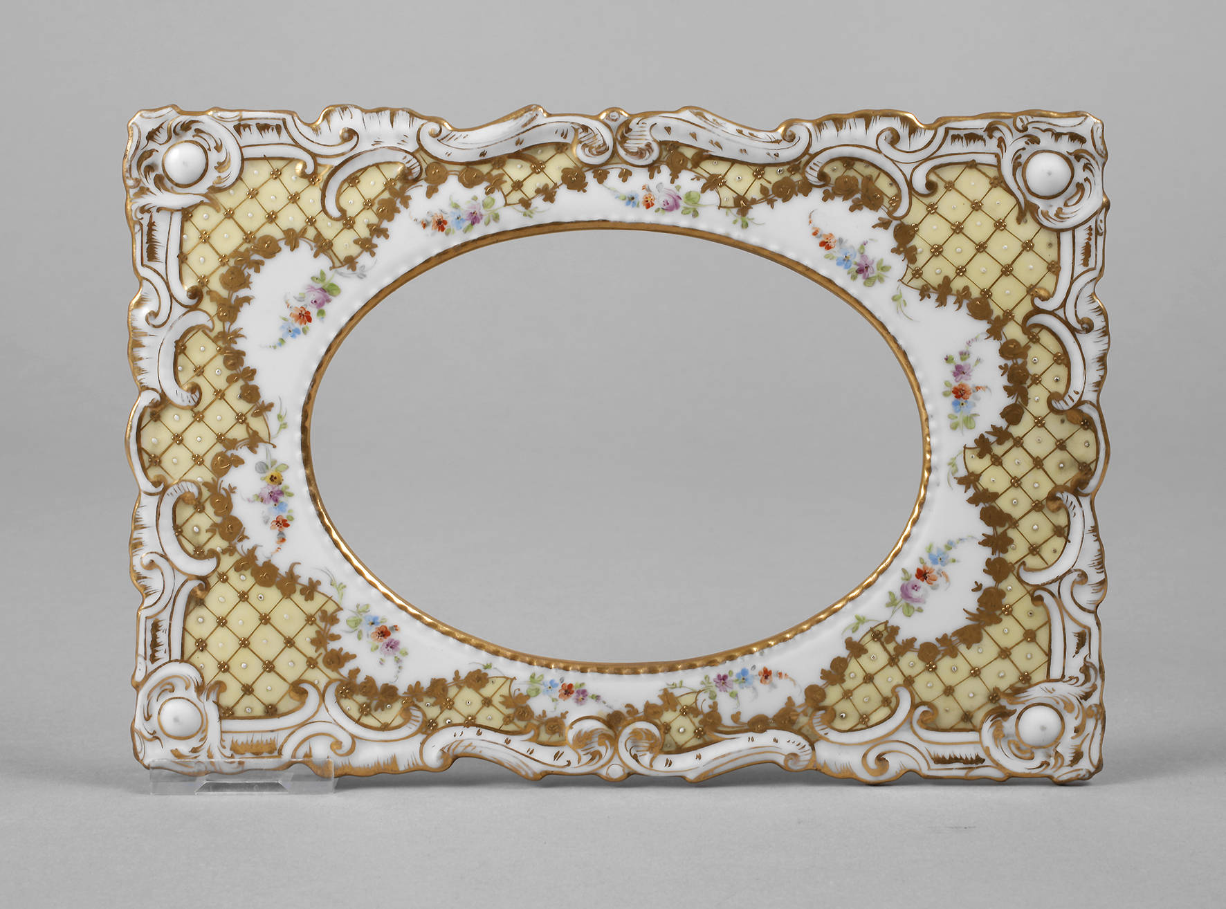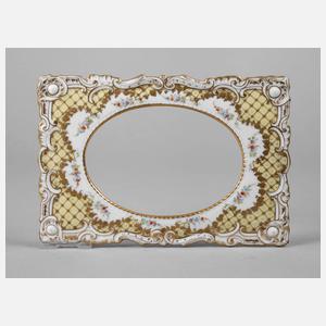 Mitte 20. Jh., Porzellan, grüne Stempelmarke Dresden Germany, feine Reliefgoldmalerei, Gitterdekor und Blütenranken, reliefierte Rocaillen, polychrom gemalte Streublümchen, gute Erhaltung, Maße 22 x15 cm bzw. 13,5 x 9,5 cm.