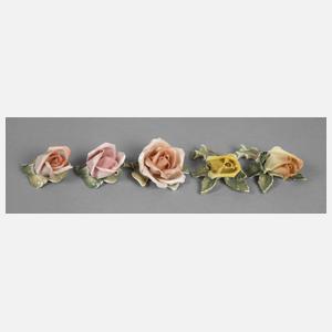 1930er Jahre, Porzellan, grüne Stempelmarken, verschiedenfarbig bemalte Rosenblüten als Tischdekoration, gute Erhaltung, L max. 10 cm.