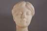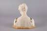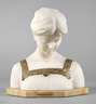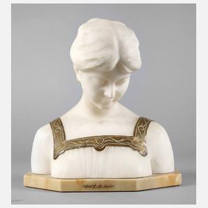 um 1900, rs. an der Schulter sign. sowie am Stand eingelassene runde Gießereiplakette S & Co. mit Zirkel (ligiert), Alabaster, ornamental verzierte Montur aus bräunlich patinierter Bronze, Bruststück einer Jugendstilschönheit mit andächtig gesenktem Blick, das lange Haar locker zusammengebunden, auf flachen, oktogonal facettierten, hellen Marmorsockel montiert, dieser vs. mit kleiner Messingapplikation, Sockel minimal bestoßen, minimale Altersspuren, H Büste 25,5 cm, H gesamt 27,5 cm.