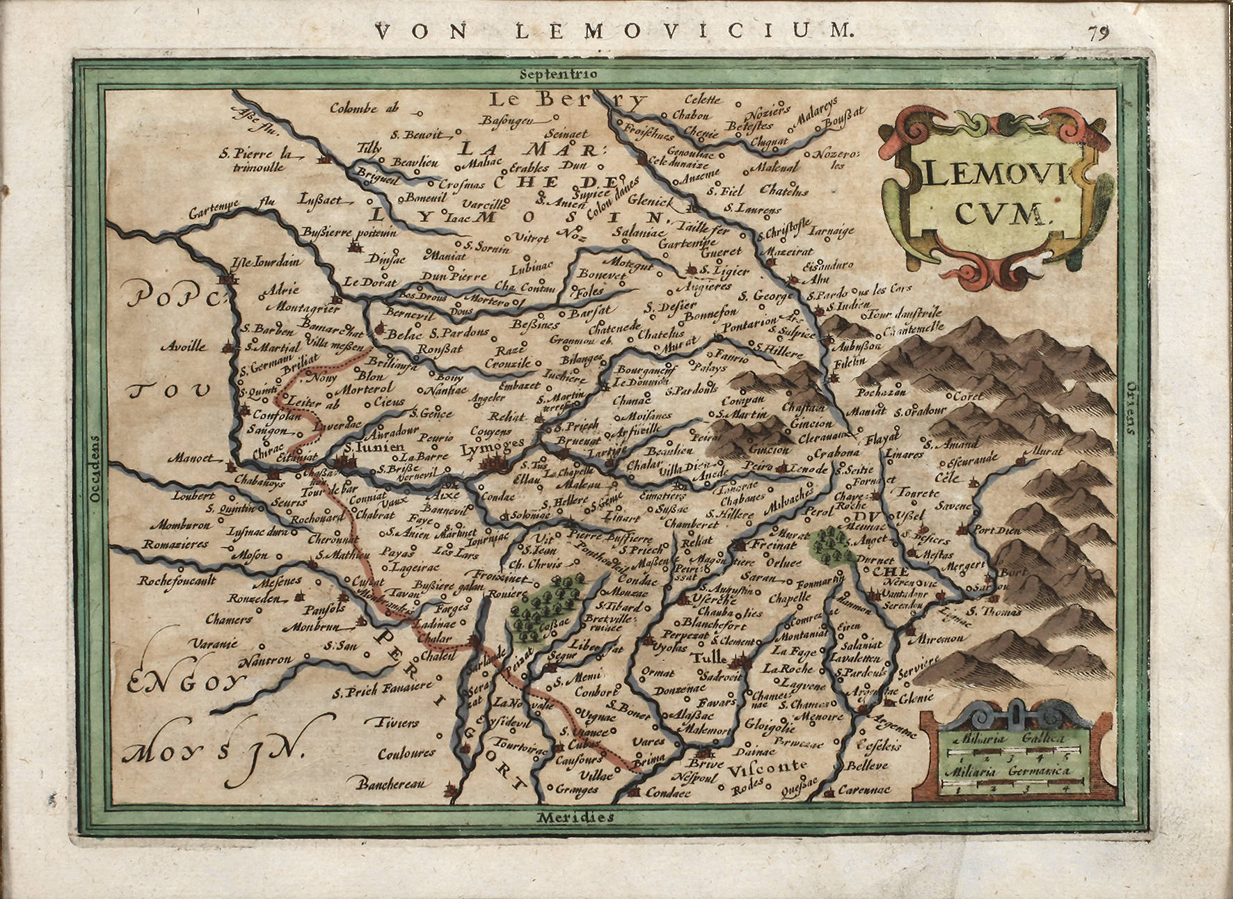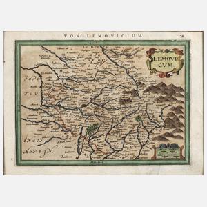 von Janssonius, um 1630, colorierter Kupferstich mit Teilen von Frankreich, im Zentrum die Stadt Limoges, im Passepartout, Blattausschnitt 17 x 23 cm. Künstlerinfo: Johannes Janssonius: niederländischer Kartograf und Verleger (ca. 1588 Arnheim bis 1664 Amsterdam), Schüler von Jodocus Hondius, heiratete 1612 dessen Tochter Elisabeth und übernahm nach Hondius Tod 1612 dessen Verlag, den er weiterführte und das von Hondius herausgegebene Atlaswerk „Mercator-Hondius“ mit dem Zusatz „...-Janssonius“ weiter herausbrachte, 1639 Herausgabe seines bedeutendsten Werkes ”Theathre du Monde” in 3 Bänden, das bis 1662 auf 11 Bände anwuchs, stand in lebenslanger Konkurrenz zu Joan Blaeu, tätig in Amsterdam, Quelle: Wikipedia.