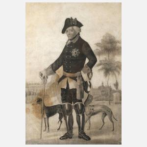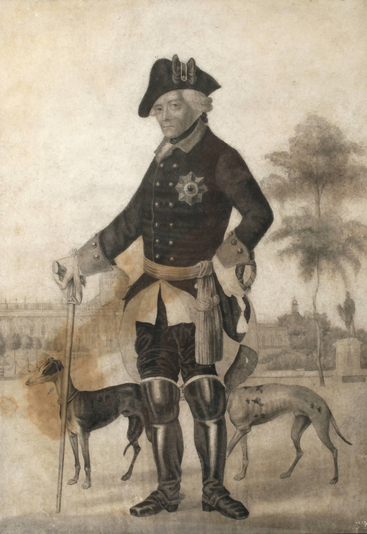 Darstellung des preußischen Königs Friedrich II., genannt ”der Große” oder ”Alter Fritz” (1712–1786) mit Schwarzem Adlerorden und seinen Hunden vor dem 1763–69 als Gästehaus errichteten Neuen Palais im Park von Sanssouci, fein erfasste Mischtechnik als Grisaille (lavierte Tusche, Aquarell und Bleistift) auf Papier, um 1800, auf Büttenkarton geheftet und schwarz konturiert, unsigniert, fleckig und gering beschabt, hinter Glas im Bilderträger, Blattmaß ca. 31 x 22 cm.