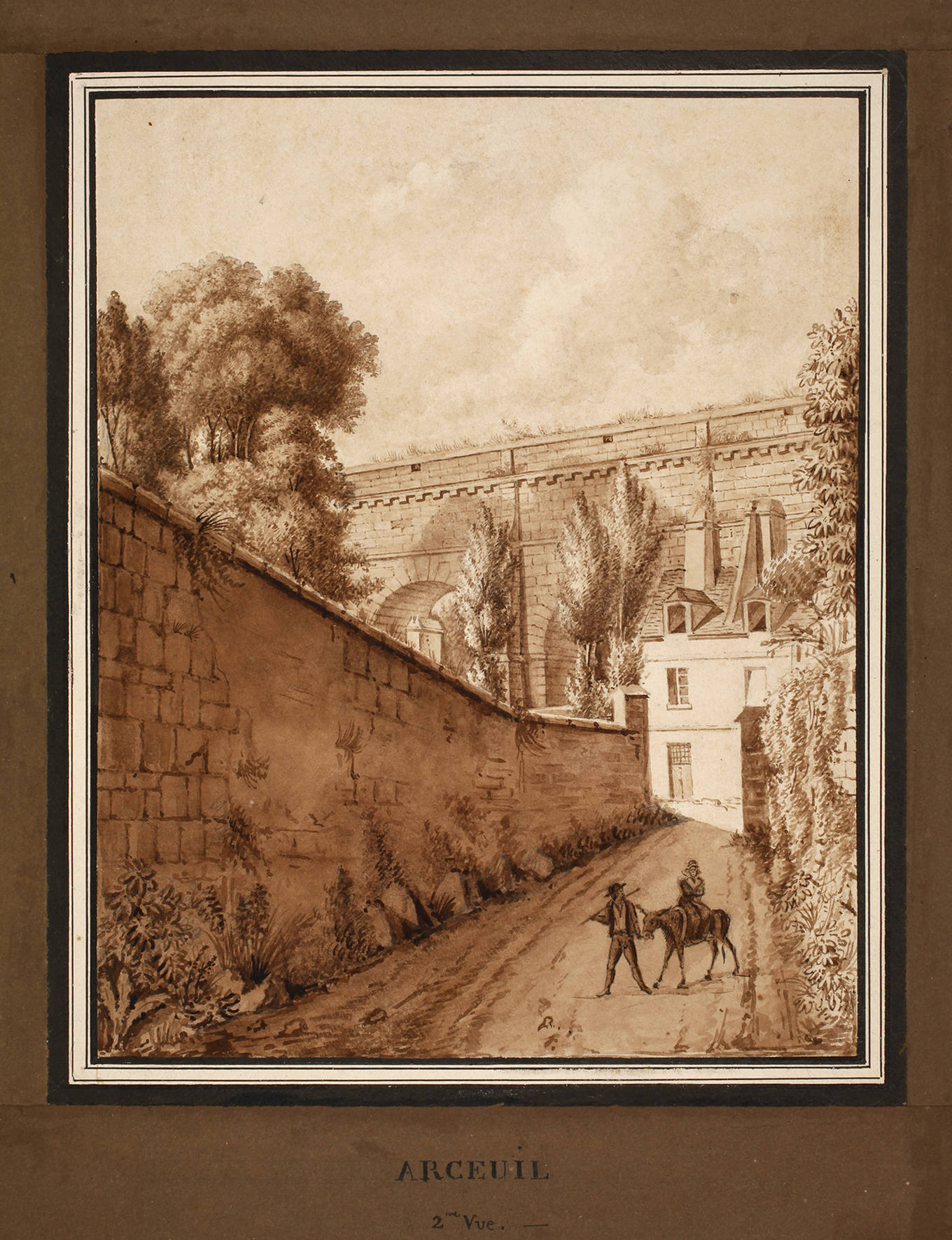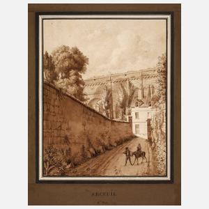 Blick auf einen Aquädukt in der nordfranzösischen Gemeinde bei Paris, feine Vedutenmalerei in Camaieutechnik mit gemaltem Passepartout, lavierte Tuschezeichnung in Sepia, wohl 1. Hälfte 19. Jh., unsigniert, auf Karton aufgezogen, hier alt bezeichnet ”Arceuil 2te Vue”, geringe Altersspuren und Montierungsreste, im Passepartout, ungerahmt, Blattmaß ca. 32,5 x 27,5 cm.