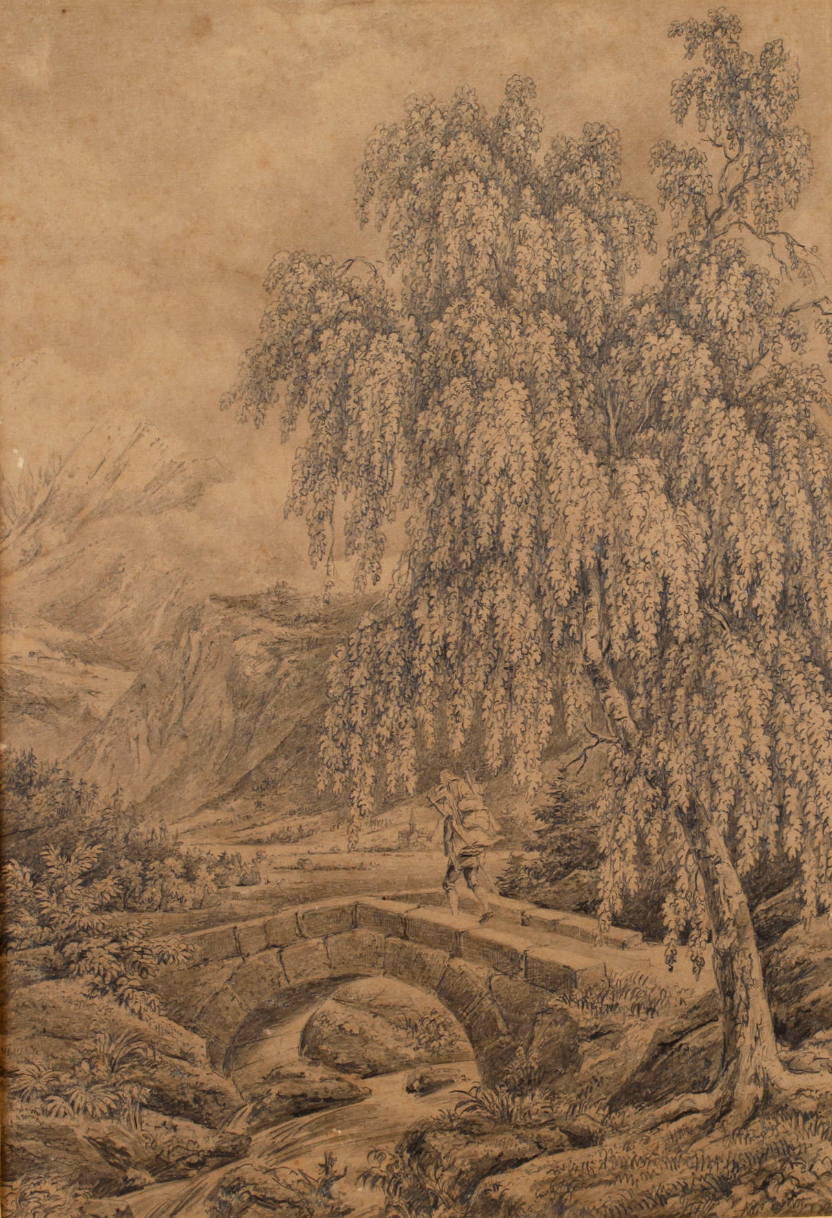 detailreich gezeichneter Blick in eine romantische Berglandschaft mit Steinbrücke und Wanderer, Bleistift auf Papier, unsigniert, auf dunkles Papier geheftet und bezeichnet Schirmer, auf dem Passepartout zugeschrieben und unleserlich bezeichnet, etwas fleckig und minimale oberflächliche Fehlstellen, IM 18,3 x 26,3 cm. Künstlerinfo: Johann Wilhelm Schirmer, 1807 Jülich bis 1863 Karlsruhe.