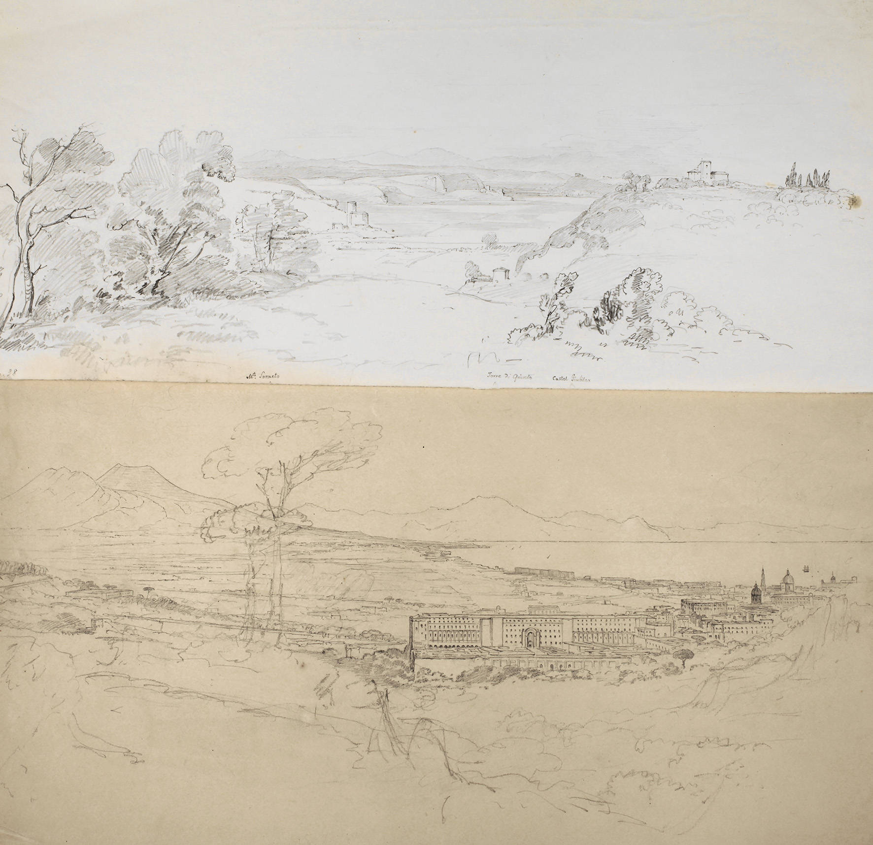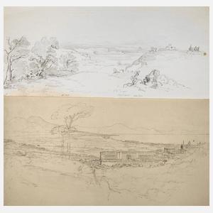 dabei Ansicht der Umgebung von Rom mit Blick auf den Monte Soratte (Mte. Soracto), den Torre di Quinto und das Castel Giubileo sowie zweites Blatt mit Blick über Neapel mit der mächtigen, 1750 bis 1766 errichteten ”Albergo dei Poveri (Herberge der Armen)”, auch genannt ”Palazzo Fuga”, Bleistiftzeichnungen, unsigniert, 1 x datiert ”7. Jan. (18)38”, je geringe Altersspuren, ungerahmt, Blattmaß ca. 20 x 47 cm bzw. 34 x 44 cm.