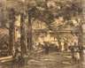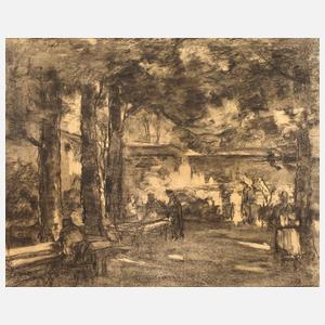 flott erfasste Szene unter freiem Himmel, zwischen schattenspendenden Laubbäumen aufgereihte Tische mit Ausflüglern bei der Rast, impressionistisches Sujet, Kohlezeichnung auf Papier, 1. H. 20. Jh., unsigniert, min. Altersspuren, ungerahmt, Maße 33,5 x 42 cm.