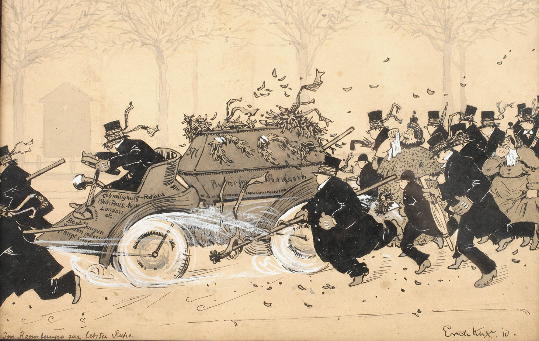 karikative Darstellung eines rasenden Bestattungswagens sowie eines sich anschließenden illustren Trauerzuges, Mischtechnik (Tusche und Gouache), rechts unten signiert und datiert ”Erich Kux (19)10”, links betitelt ”Im Rennauto zur letzten Ruhe”, Pendant zur nachfolgenden Position, hinter Glas gerahmt, Falzmaß 21,5 x 34,5 cm. Künstlerinfo: dt. Maler, Grafiker, Gebrauchsgraphiker, Illustrator und Karikaturist (1882 Quedlinburg bis 1977 Lentföhrden bei Kiel), zunächst Lehre zum Kaufmann, studierte ab 1904–06 an der Kunstschule Kassel bei Schick, 1906 Zeichenlehrerexamen, 1906–10 Studium an der Akademie Berlin bei Anton von Werner und Georg Koch, belegt 1907 parallel Kurse an der Unterrichtsanstalt des Kunstgewerbemuseums Berlin bei Emil Orlik, neben seinen Studien als Zeichenlehrer am Lettehaus und an der Städtischen photographischen Fachschule Berlin tätig, ab 1910 freiberuflich in Berlin-Wilmersdorf, unter anderem für Berliner Buchverlage und Zeitungen tätig, lieferte Beiträge für ”Westermanns Monatshefte”, den ”Kladderadatsch” und die Münchner Zeitschrift ”Jugend”, unternahm Studienreisen nach Mittel- und Süddeutschland, ab 1919 Mitglied im Verein Berliner Künstler, Mitglied im Reichsverband Bildender Künstler Deutschlands, beschickte die Berliner Akademieausstellungen und die Großen Berliner Kunstausstellungen, 1943 Rückkehr nach Quedlinburg, 1958 Übersiedlung nach Hamburg, 1971 Ehrung mit dem Künstlerpreis ”Silber-Möve” der Stadt Hamburg, Quelle: Thieme-Becker, Vollmer, Dressler, Eisold ”Künstler in der DDR” und Internet.