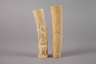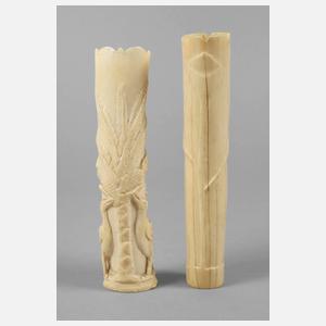 aus den Spitzen des afrikanischen Waldelefanten gefertigt, reliefiert beschnitzt, schreitendes Vogelpaar an Palme mit Schlange sowie florales Motiv, ein Stück mit Trocknungsrissen, H 19 und 20 cm.