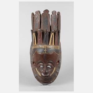 Sierra Leone, 20. Jh.,Tropenholz, Ritualmaske der Bundus, des geheimen Frauenbundes, traditionell aufwendig gearbeiteter Kopfputz (Doppelkrone), tlw. bemalt, H ca. 54 cm.