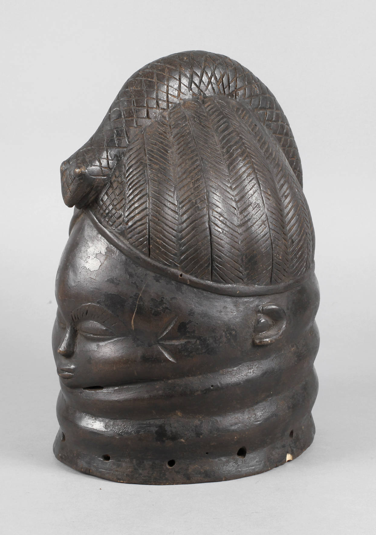 Sowei/Sowo-Maske oder Bundu-Maske, Sierra Leone 20. Jh., leichtes Tropenholz geschwärzt, Ritualmaske des geheimen Frauenbundes, gute Erhaltung, H ca. 40 cm, D ca. 23 cm.