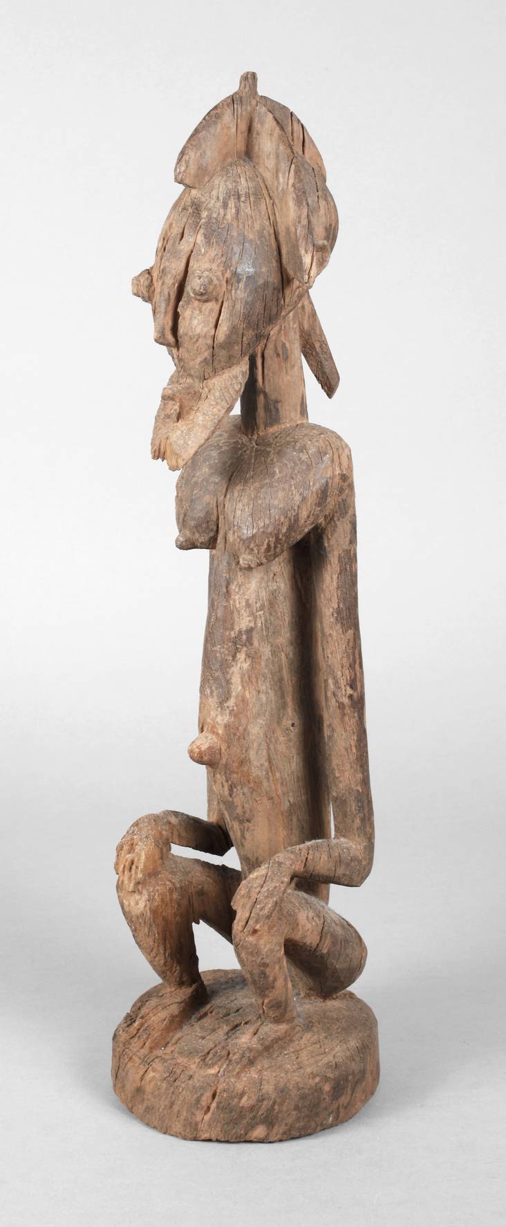 Burkina Faso bzw. Ost-Mali, 18./19. Jh., schweres, eisenhartes Holz, sitzende Figur mit weiblichen und männlichen Merkmalen, stärker trocknungsrissig, H 53 cm, aus Alt-Sammlung. Info: Die Dogon-/Tellem-Figuren zählen zu den ältesten Skulpturen Schwarzafrikas, erhalten durch die gesicherten Steilhänge des Hombori-Bergs.