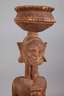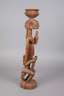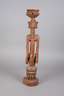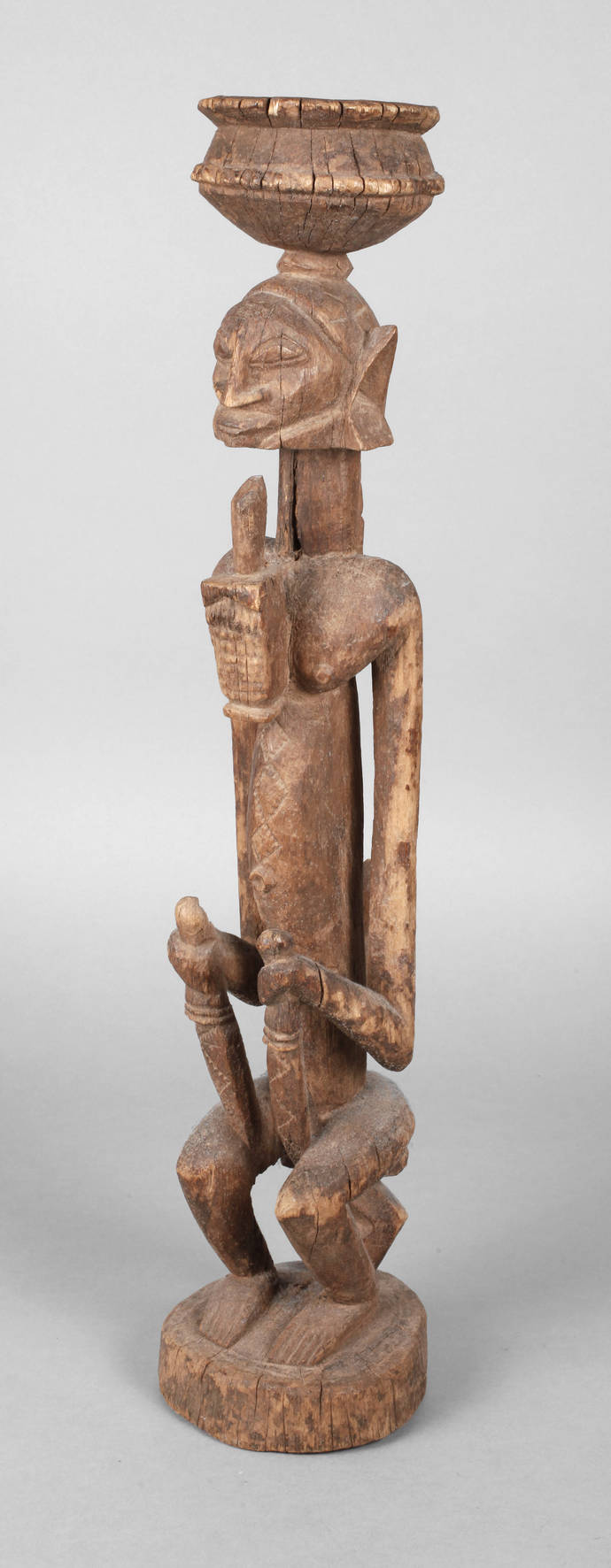 wohl Stamm der Dogon, 1. Hälfte 20. Jh., wohl Teak, sitzende Gestalt in abstrakter Formensprache, div. Attribute am Körper bzw. auf dem Haupt tragend, rückseitig emporkriechende Schlange, kleinere Schäden, H 32 cm.