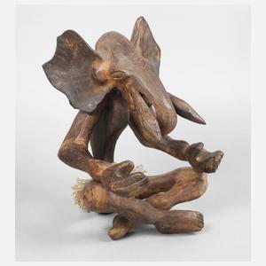 2. Hälfte 20. Jh., sitzende Figur im Lendenrock, mit Elefantenhaupt und auf die Knie gelegten, empfangenden Händen, H 34 cm.