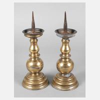 18. Jh., Messing patiniert mit reliefierten und punzierten Blüten sowie Früchten, je auf drei Kugelfüßen stehend, Balusterschaft, breite Tropfschalen mit hohem Dorn, starke Gebrauchs- und Altersspuren, alt repariert, H 45 cm.