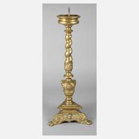wohl Italien, 18. Jh., Messing gegossen, zweiteilig verschraubt, dreipassiger Fuß mit Volutenmotiven, Schaft mit Nodi und Baluster, Tropfschale mit hohem Dorn, Alters- und Gebrauchsspuren, H 40 cm.