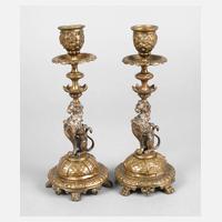 um 1880, am Boden alte Klebeetiketten, beschriftet ”Hochzeitsgeschenk Löwenstein aus ...Elfchen?”, Messing gegossen und patiniert, mehrteilig verschraubt, reich dekoriert mit Löwentatzen, Schuppenmotiven, Palmetten und Maskaronen an den Tüllen, der Schaft als plastischer, schildtragender Löwe gestaltet, Alters- und Gebrauchsspuren, H 21,5 cm.