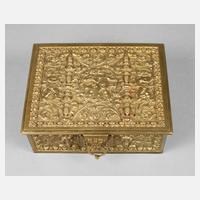 wohl Erhard & Söhne Schwäbisch Gmünd, 1920er Jahre, ungemarkt, reich reliefiert mit Rollwerk und Blütenbändern, scharnierter Klappdeckel, innen mit Holz ausgekleidet, Schlüssel ergänzt, L 19,5 cm.