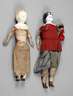 Biedermeierpuppen, 2. Hälfte 19. Jh., ungemarkt, Brustblattkopf aus glasiertem Porzellan mit schwarz getönter Hochsteckfrisur bzw. Biskuitporzellan mit blond getönter Seitenscheitelfrisur, Stoffkörper mit Schlenkergliedern und Biskuitporzellan-Unterarmen bzw. -Schenkeln mit gemaltem Schuhwerk sowie Resten der orig. Kleidung, restaurierungsbedürftige Originalzustände, Köpfe lose, Brustblatt-Bruchstück beiliegend, ein Unterarm fehlt, L 28 und 24 cm.