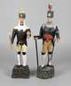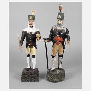 19. Jh./Anfang 20. Jh., Holz geschnitzt und farbig gefasst, Darstellung als sächs. Bergmänner in Annaberger Paradeuniform mit angesetzten Armen, in der Händen Kerzentülle bzw. Attribute haltend, jeweils auf hohem Sockel stehend, Alters- und Gebrauchsspuren, reparaturbedürftig, einer an der Schulter repariert, Attribute teils ergänzt bzw. fehlend, H 54 und 58 cm.